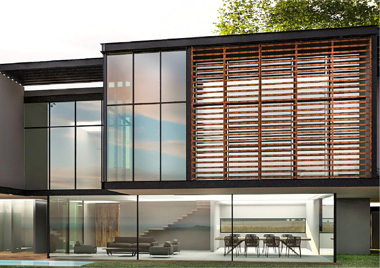 Residencia de dos niveles, la cual se desplanta en un terreno con 12m de desnivel. 750m2 de construcción.