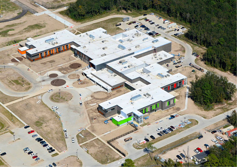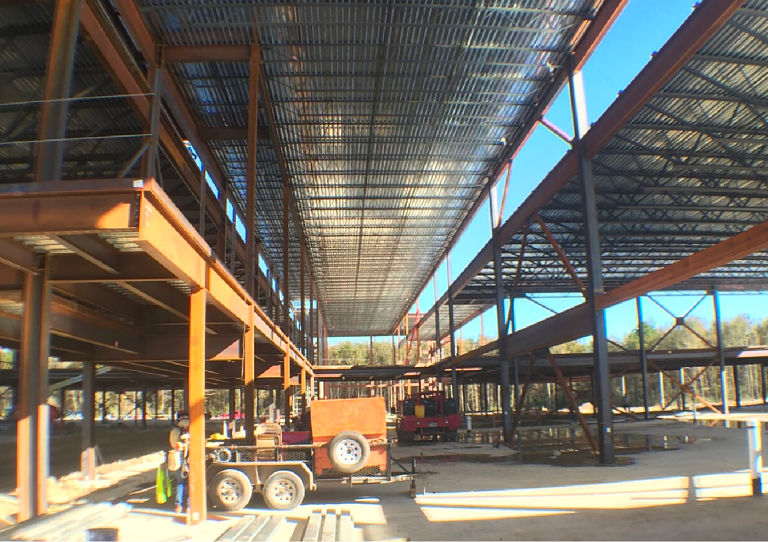 Marcos OCBF de acero para controlar sismo y viento. Sistema de entrepiso de vigas secundarias + deck metálico con concreto y sistema de azotea de “joist” + deck metálico sin concreto. Cimentación por medio de pilas coladas en sitio.