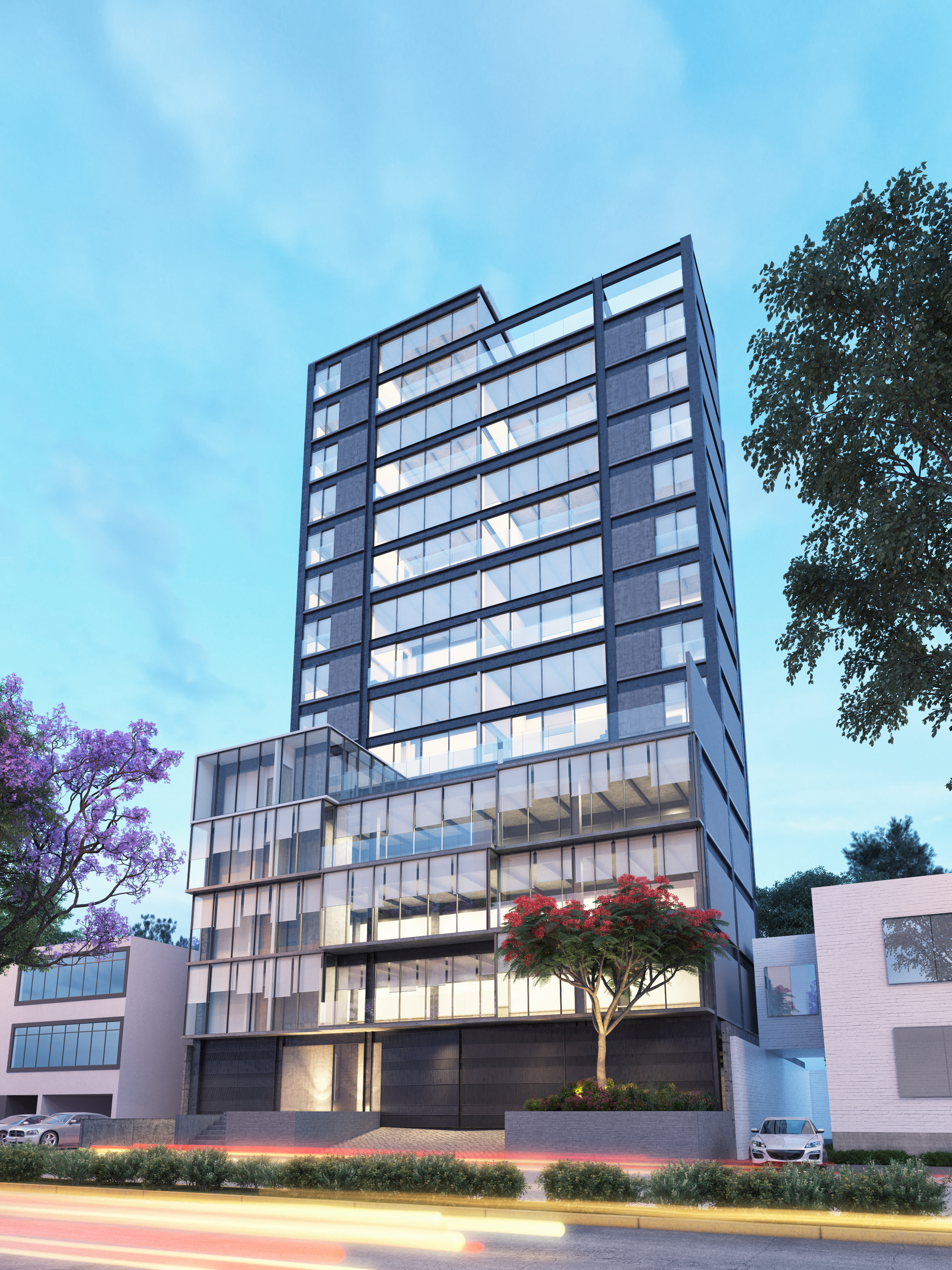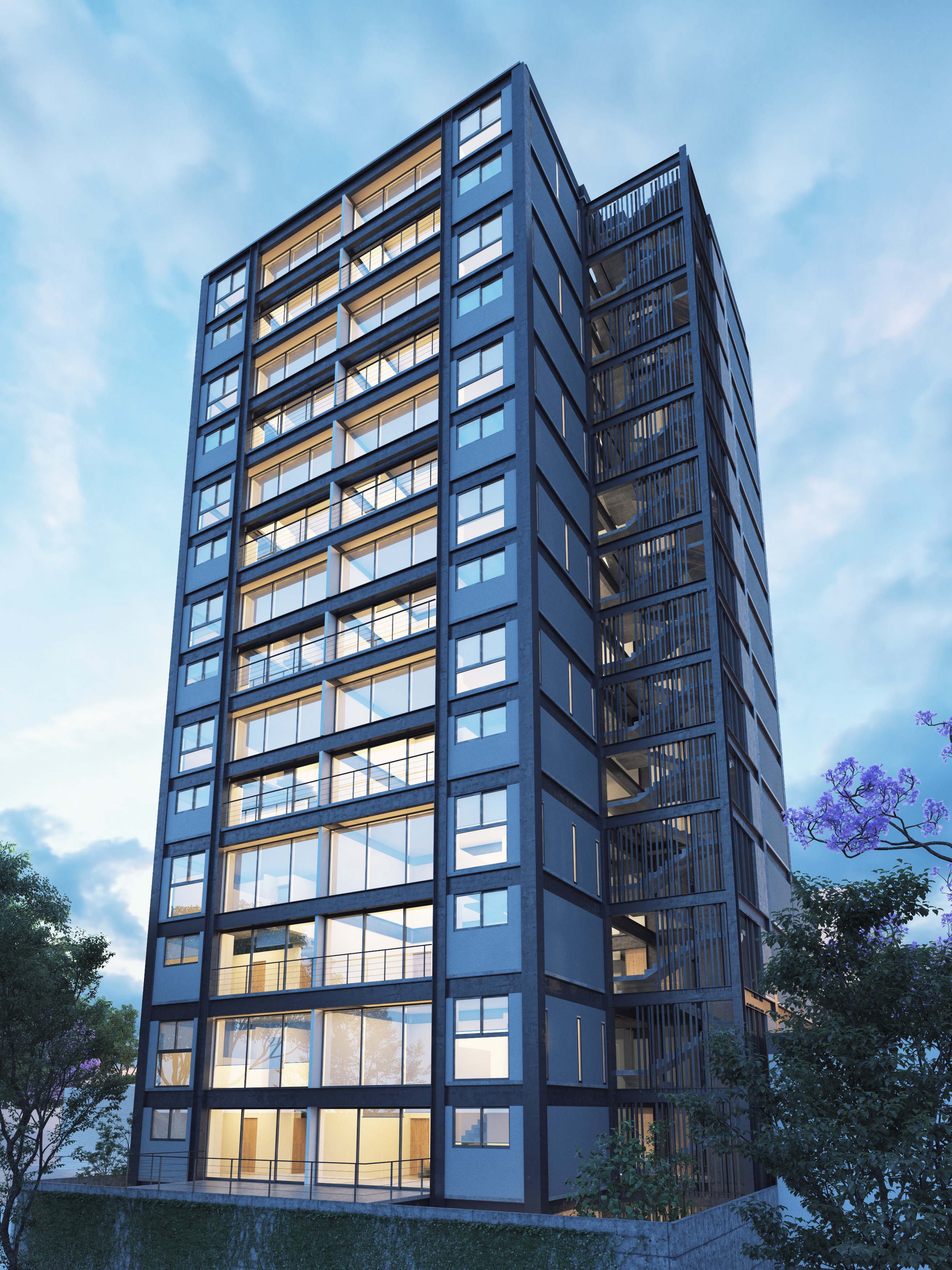 Torre de uso mixto, oficinas/habitacional. Cuenta con un medio sótano, un nivel de estacionamiento y 16 niveles de departamentos tipo “lofts” de doble altura y oficinas en el módulo frontal. 4,530m2 de construcción.